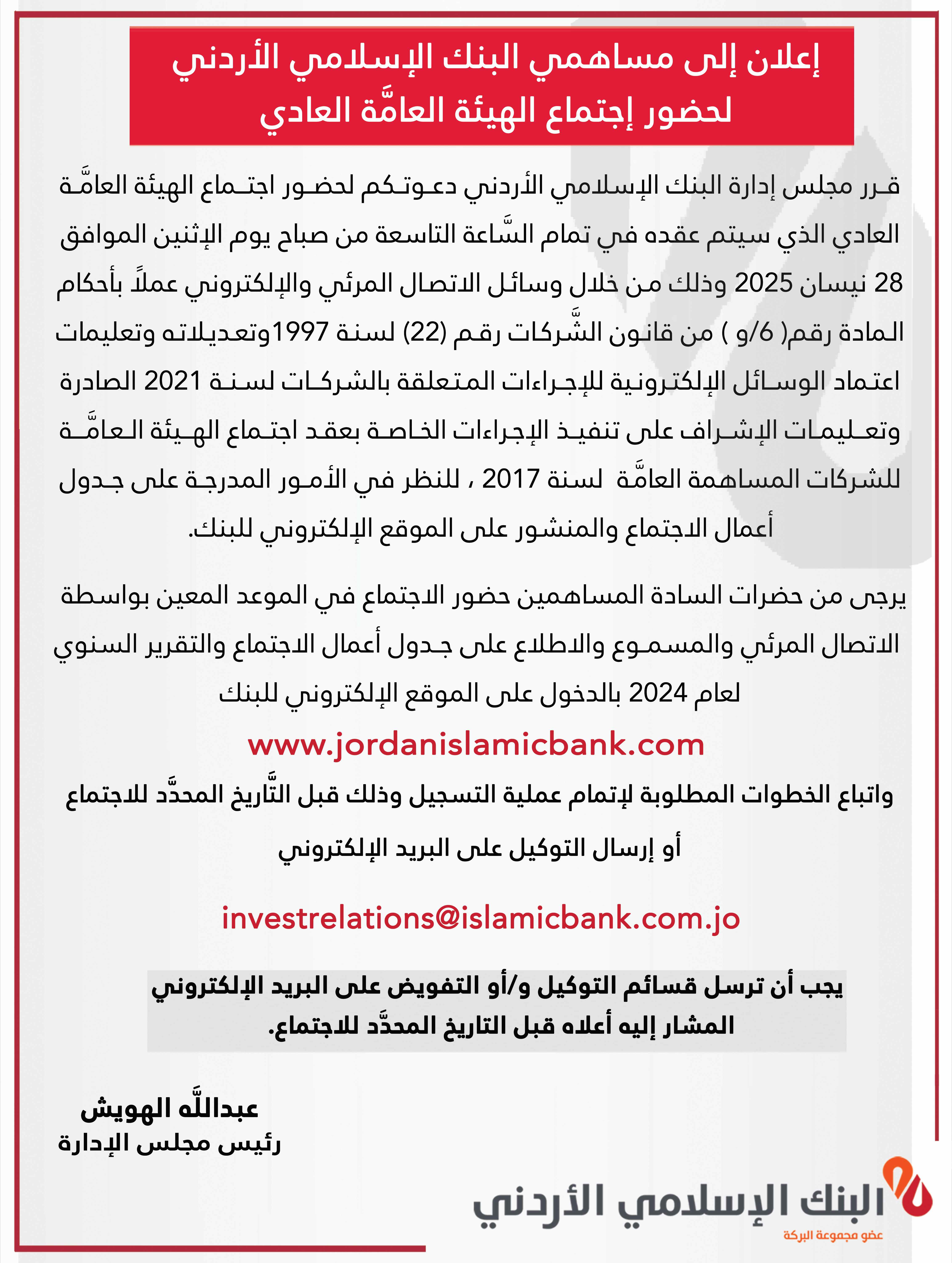 - اعلان لحضور اجتماع الهيئة العامة العادي من خلال وسيلة الاتّصال المرئي والالكتروني 28-4-2025. للمزيد اضغط هنا